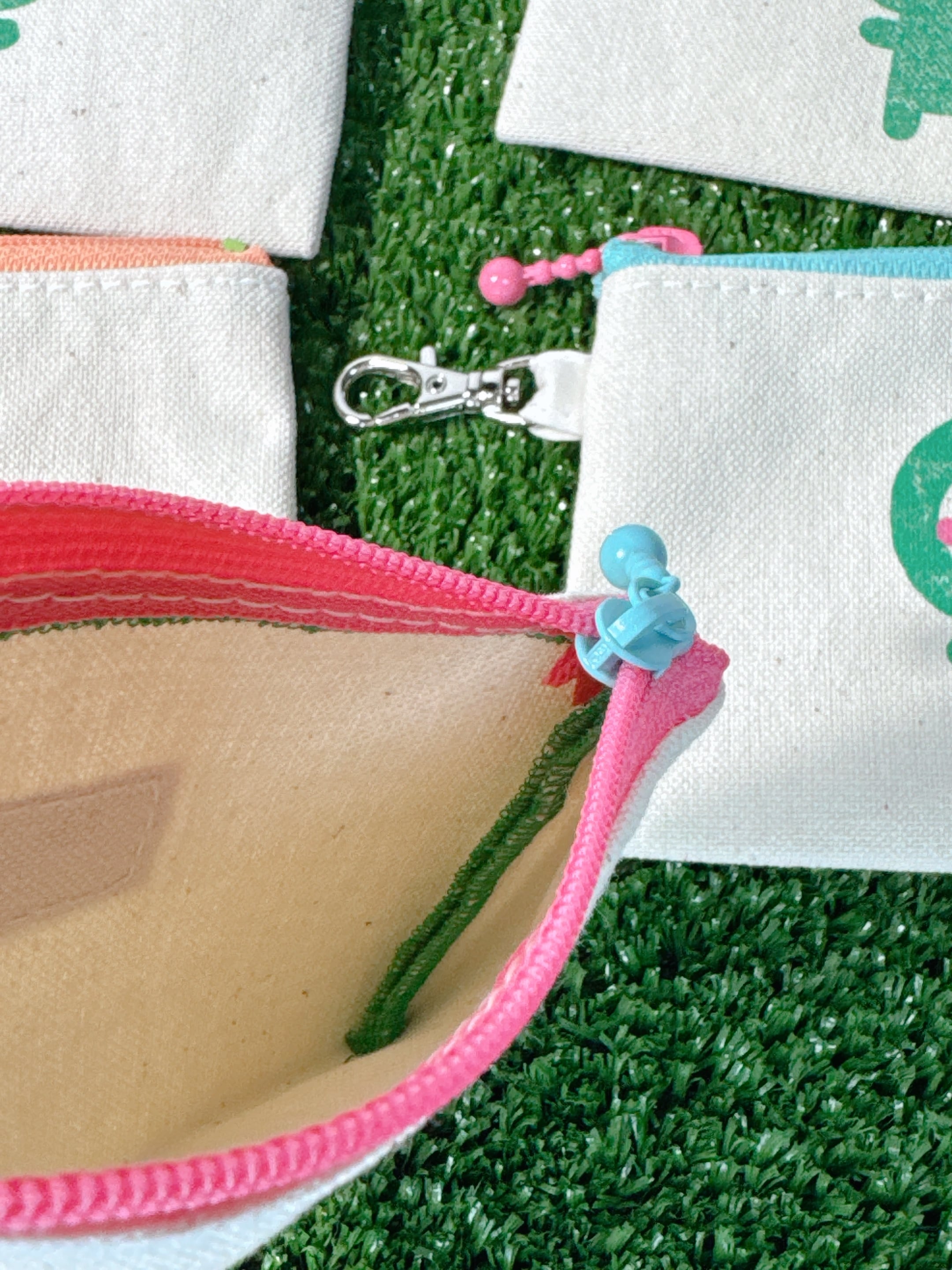 キーホルダーポーチには内布は付いてませんが、生地のほつれ止めの始末にロックミシンをしていますが、その糸の色を外側のぽーぽーさんの体の色に合わせています。